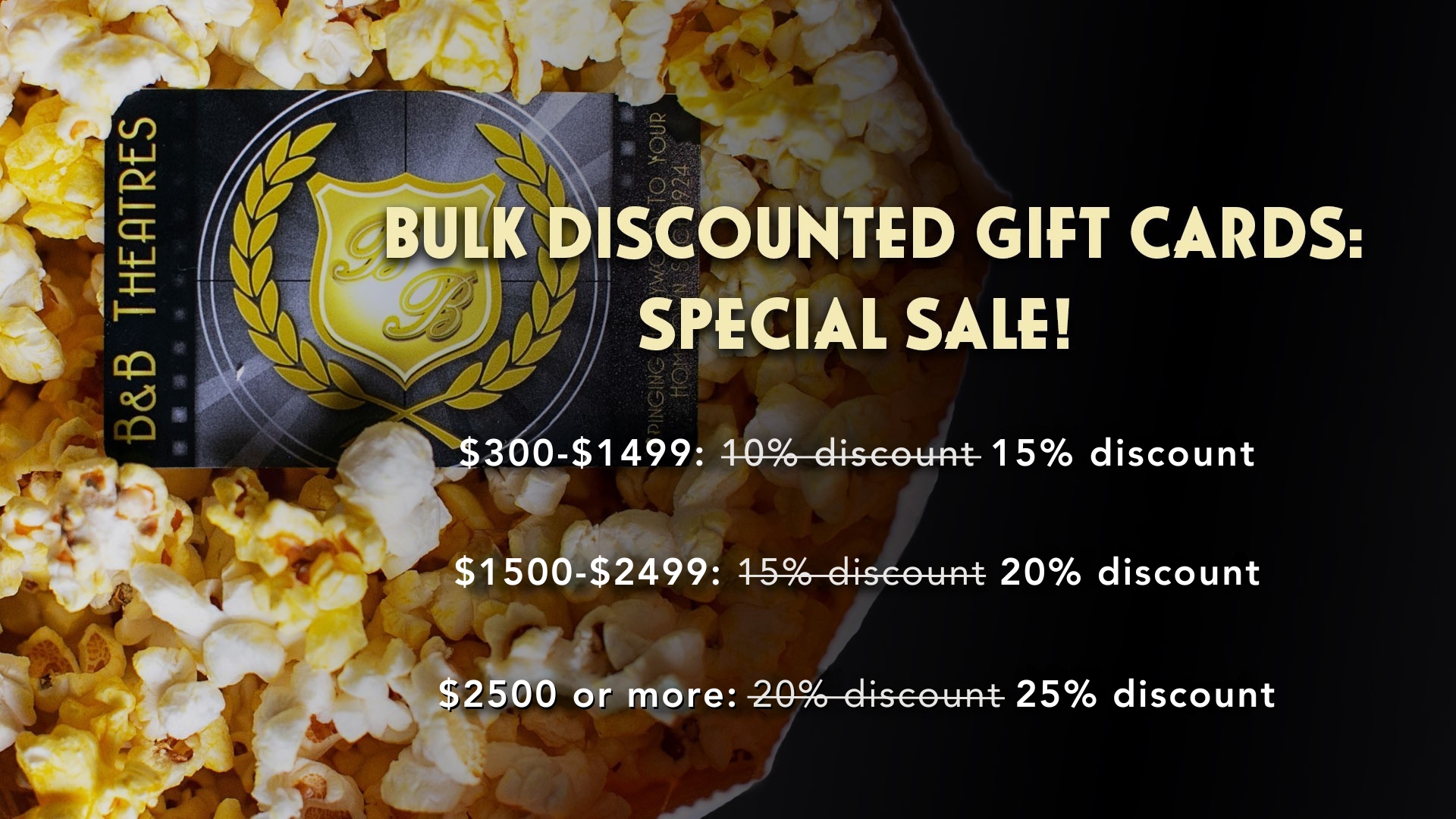 For the first time ever, take advantage of B&B Theatres' LARGEST BULK GIFT CARD DISCOUNTS EVER – the perfect way to reward employees, thank clients, or provide ongoing perks throughout the year. Whether it’s a holiday surprise, a client thank-you, or a monthly recognition program, our gift cards make every occasion magical!
