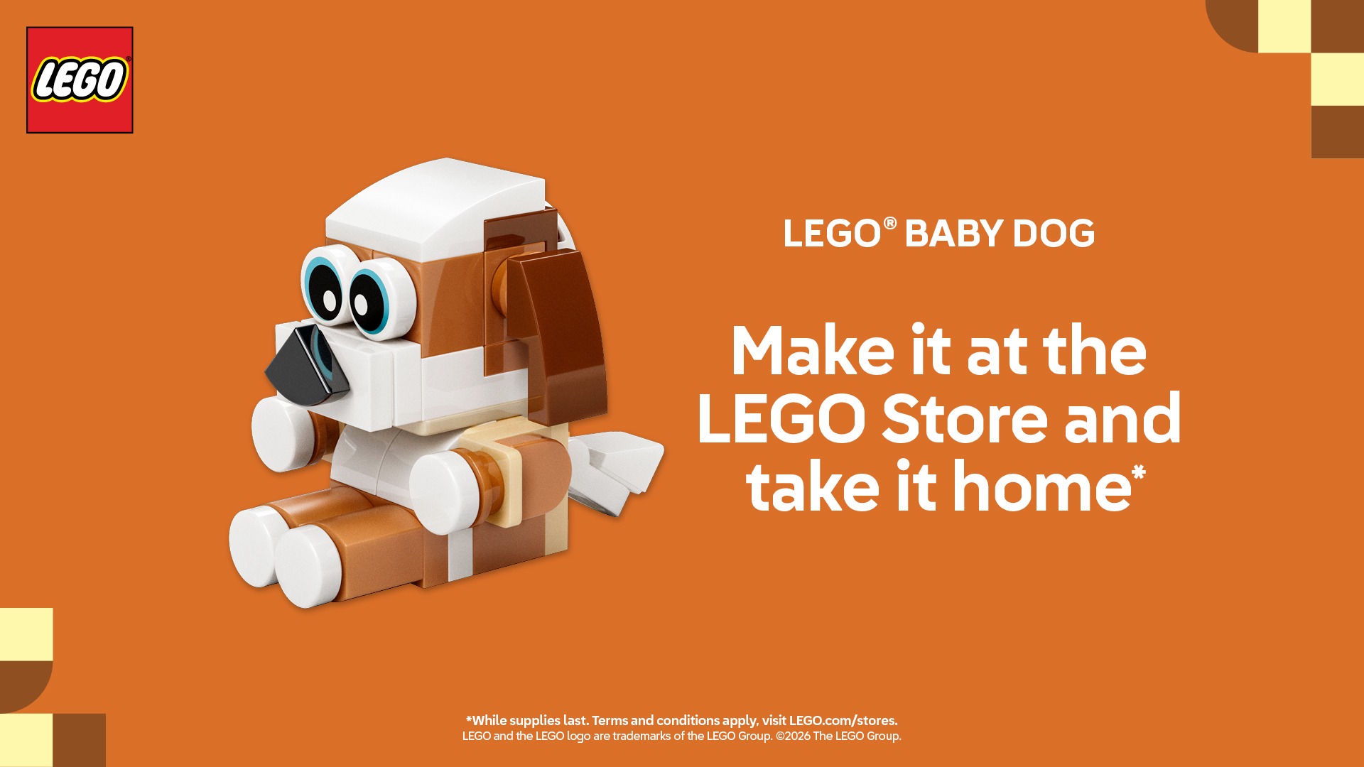 Visit a participating LEGO® Store on February 22 from Noon - 2 p.m. to build this LEGO Puppy and take it home.