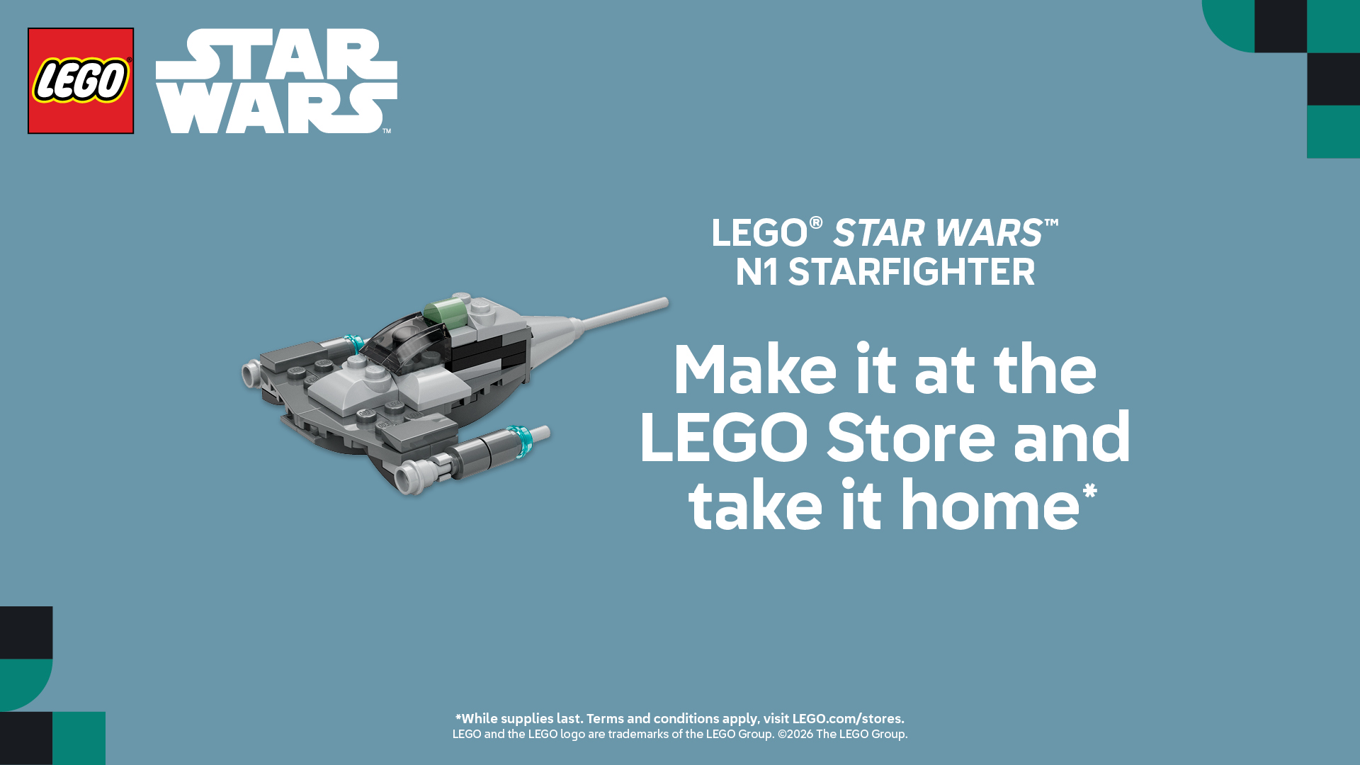 Join us to build this LEGO Star Wars™ N-1 Starfighter™ Mini build and take it home. While supplies last. Terms & Conditions apply, visit www.LEGO.com/stores to find out more.