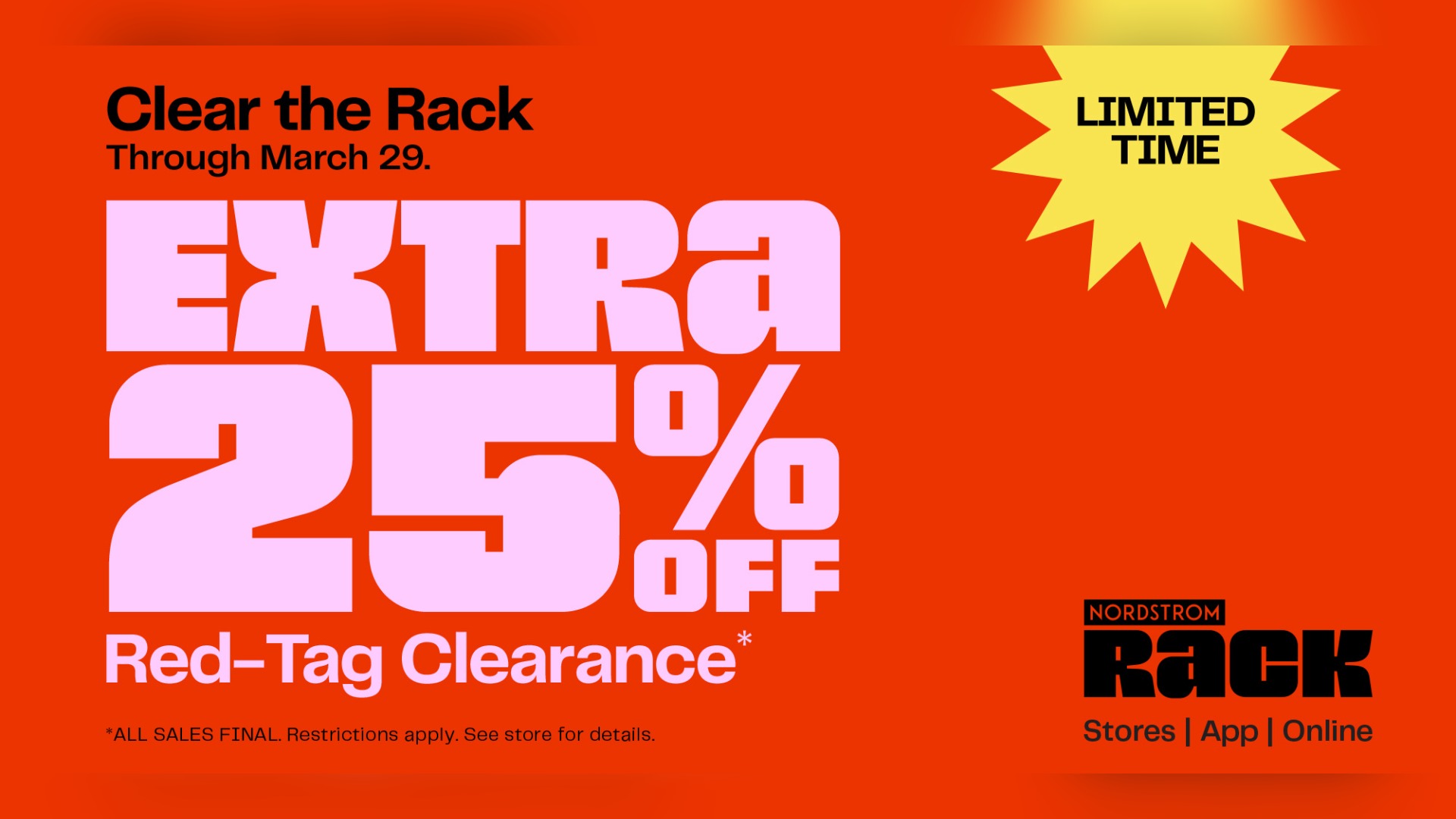 Now through March 29, get an EXTRA 25% OFF red-tag clearance items for total savings up to 75% off. You’ll save even more on your favorite brands. But hurry—the best stuff goes fast!