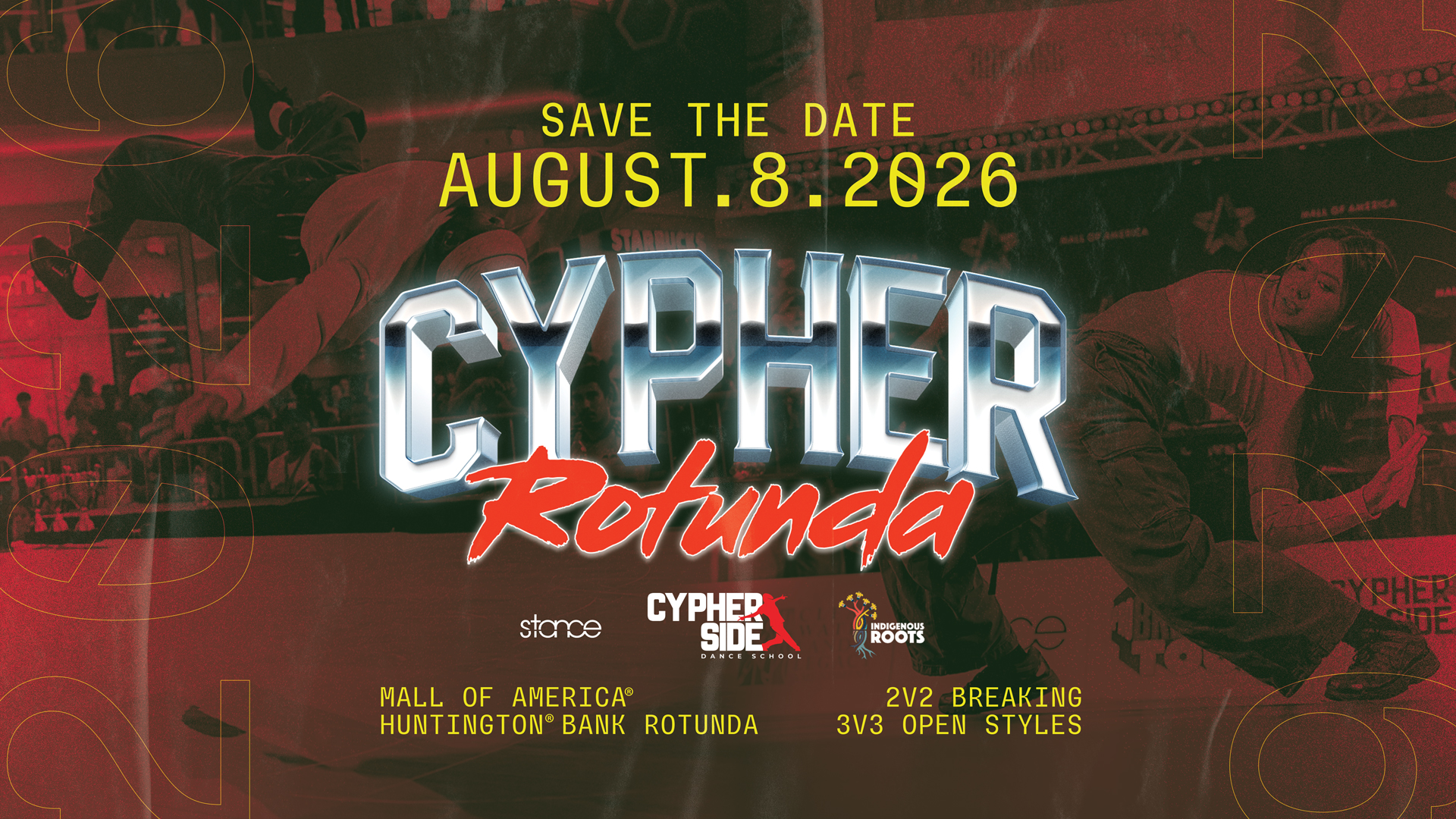 Get ready for Cypher Rotunda, the largest street dance battle in Minnesota, taking over the iconic Rotunda at Mall of America. Hosted by Cypher Side Dance School, this event brings top dancers from across the country to compete in battles featuring breaking (break dance), popping, krumping, and other street dance styles.