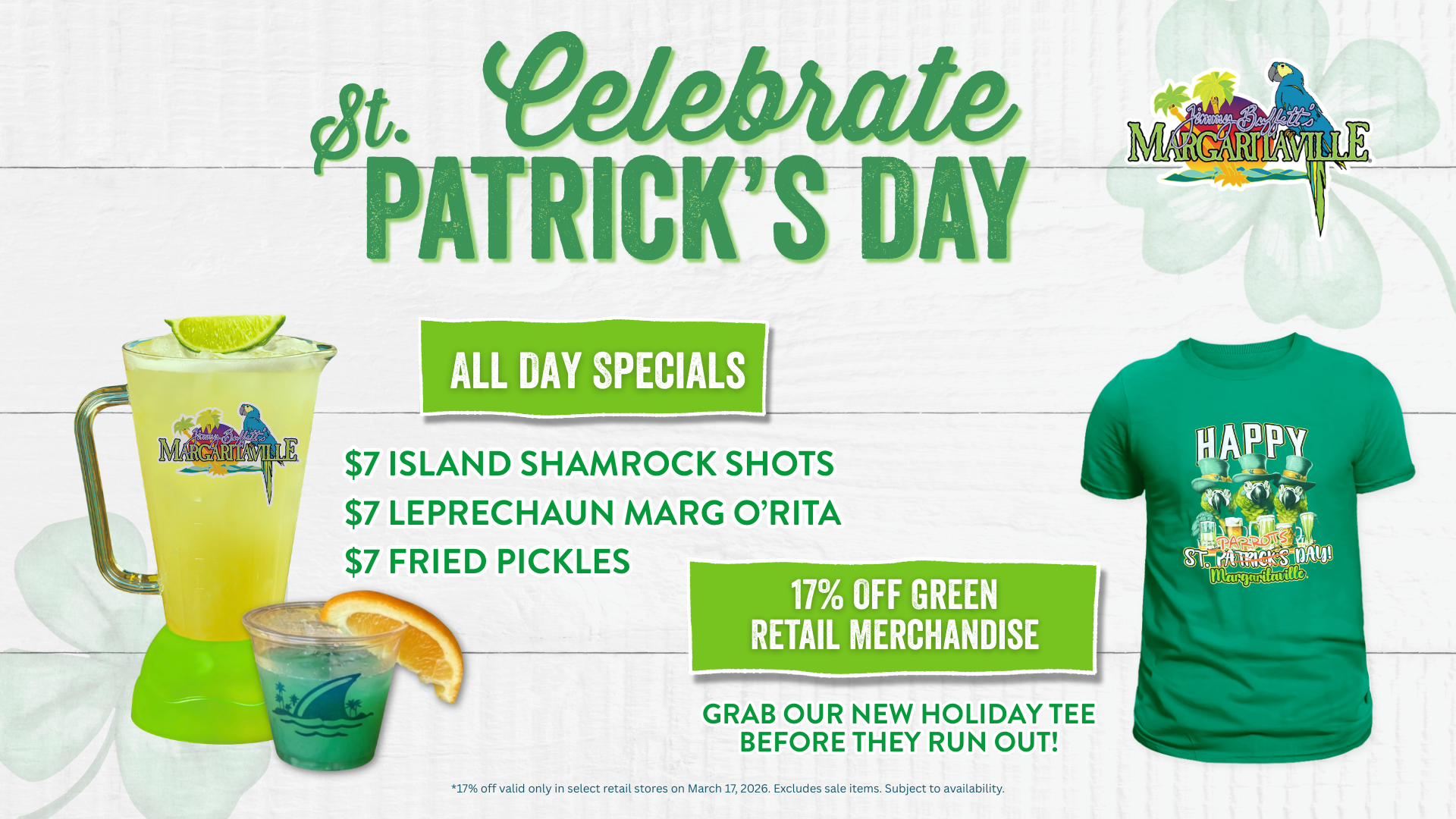 The luck of the Irish meets island time. Celebrate St. Patrick’s Day with $7 drink specials and fried pickles. Plus, enjoy 17% off green merchandise while you’re here.